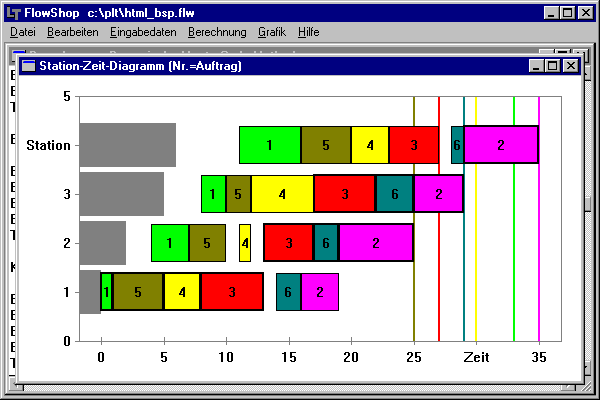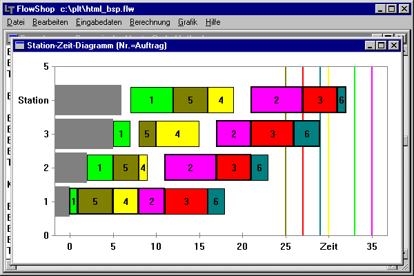 6 Aufträge (1...6) sollen 4 Bearbeitungsstationen in gleicher Reihenfolge (1->2->3->4)