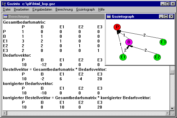 Die obigen Daten innerhalb der geschweiften Klammern können direkt vom Programm als Eingabedaten verarbeitet werden. Als Lösung wird die Strukturstückliste, die Gesamtbedarfsmatrix sowie der Bestellvektor ausgegeben, zusätzlich kann ein Gozinto-Graph dargestellt werden.