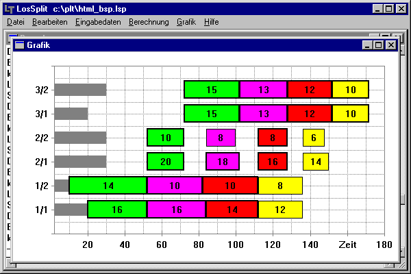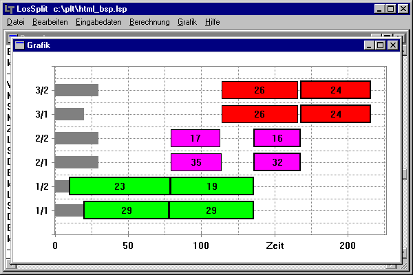 Bei der Aufteilung in zwei Teillose (Bild oben) beträgt die Gesamtdauer 216 Minuten (bei keiner Losteilung 303 min). Bei der Aufteilung in vier Teillose (Bild unten) beträgt die Gesamtdauer 172 Minuten (3 Teillose 186 min). Eine Aufteilung in noch mehr Teillose bringt kaum noch einen Zeitgewinn.