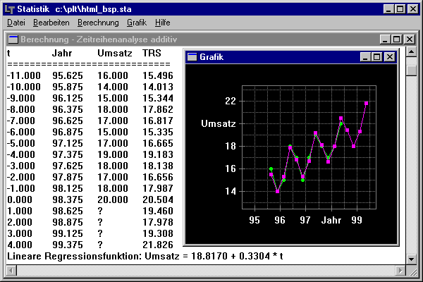Die obigen Daten sind in das Programm einzugeben, anschließend kann vom Programm eine Zeitreihenanalyse durchgeführt und die Werte für die kommenden 4 Quartale ermittelt werden. Die Lösung wird tabellarisch in einem Textfenster ausgegeben und kann zusätzlich grafisch dargestellt werden.