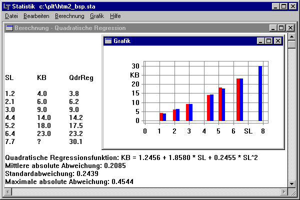 Die obigen Daten sind in das Programm einzugeben, anschließend kann vom Programm eine Regressionsanalyse durchgeführt werden. Es wurde in diesem Fall die Berechnung mittels quadratischer Regression durchgeführt. Die Schlange hat demnach pro Monat einen Kaninchenbedarf von voraussichtlich 30 Stück. (Das entspricht in etwa dem Kaloriengehalt einer Tierpflegerin.)