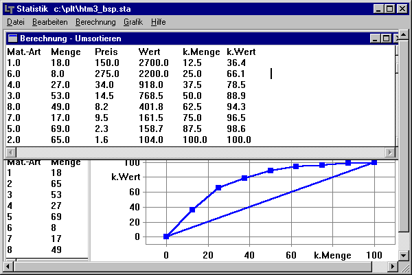 Die obigen Daten sind in das Programm einzugeben, anschließend wird zunächst eine neue Variable erzeugt: Wert=Menge*Preis. Für diese Variable wird das Konzentrationsmaß bestimmt. Die Ausgabe der Lösung erfolgt tabellatisch in einem Textfenster. Zusätzlich kann eine Grafik dargestellt werden. Die Materialarten 1 und 6 gehören demnach zur Gruppe der A-Güter, die Materialarten 3 und 4 zur Gruppe der B-Güter und die restlichen vier Materialarten zur Gruppe der C-Güter. Die Materialarten sollten dementsprechend disponiert werden.