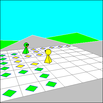 Hier ist Gelb an Zug und gewinnt: Gelb springt nach hinten auf das gelbe Feld, Grün muß auf eines der jeweils benachbarten